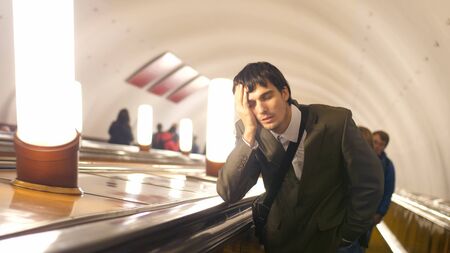Tired businessman sleepy after work, in a underground subway on escalator. hard day