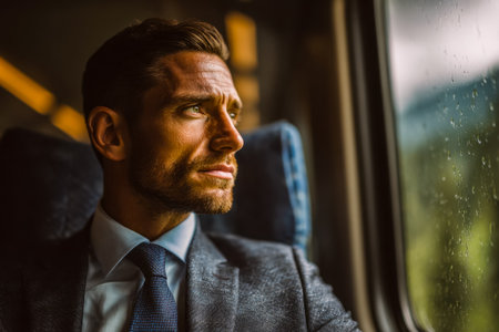 A poised executive looks outward with resolve, captured in a moment of reflection as sunlight filters through the train?s glass.