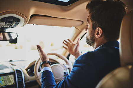 Businessman using his smartphone while driving and having a car accident, he is shocked and screaming