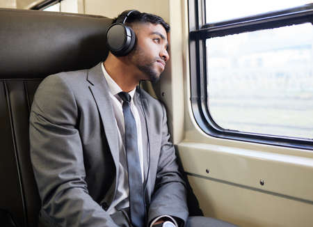 Sitting with his thoughts for a bit. a young businessman wearing headphones while staring out the window on a train during his commute.