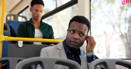 Bus, business and black man by window with earphones for journey, commute and passenger in city. Public transport, travel and person on vehicle listening to podcast, audio and radio on trip in town