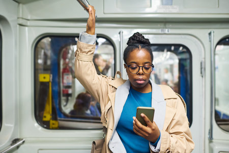 Young serious African American woman in eyeglasses holding by handrail while riding in subway train and watching video in smartphone