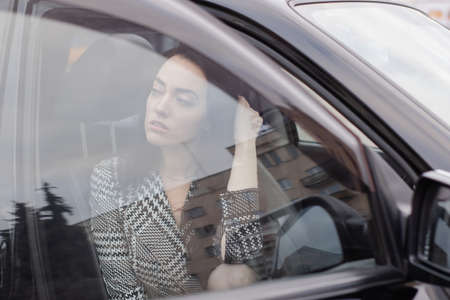 portrait of an attractive brunette in gray checkered dress in a black car. girl in automobile. business woman