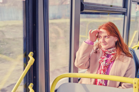 A woman rides a bus and looks at the route of traffic outside the window. The girl looks at the road putting her hand to her forehead