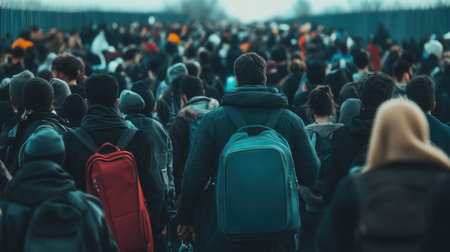 Large groups of refugees gather at a border, carrying their belongings while facing challenging conditions in cramped environments.