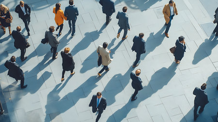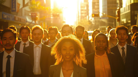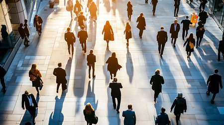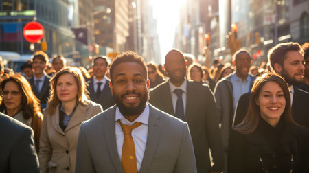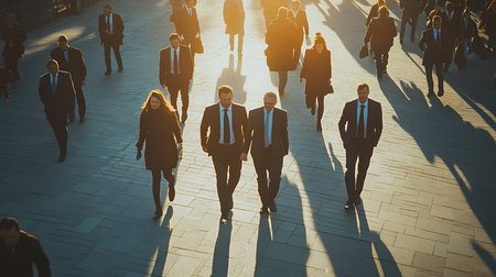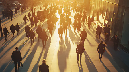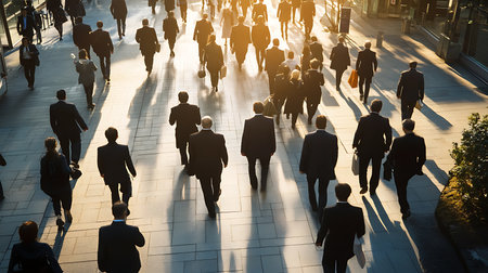 A busy scene of professionals walking through a city showcasing the hustle of urban life.
