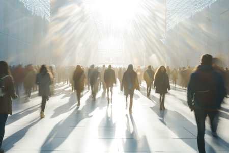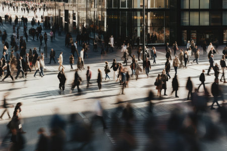 Many blurred people are quickly walking in different directions in a busy city business district during rush hour, creating a sense of urgency and stress
