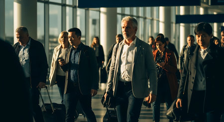 A group of business travelers walking through a modern airport terminal