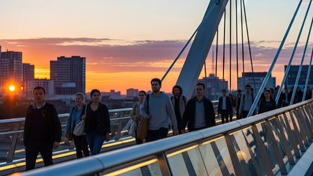 A dynamic scene of a crosssection of society on a bridge with people facing away from the camera representing the vibrant energy and .