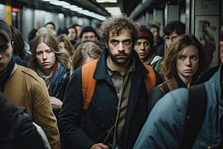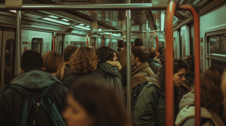 A crowded subway car during peak hours, commuters standing shoulder to shoulder as they travel together