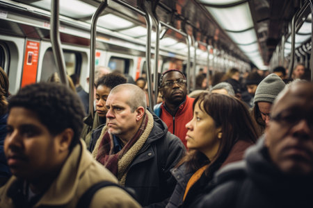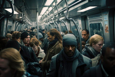 An AI generated illustration of A diverse group of people riding the subway together on their daily commute