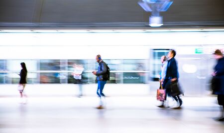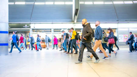 Motion blur of walking people. People on the way to work, rushing through the underground tunnel. London, UK