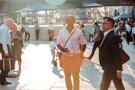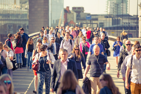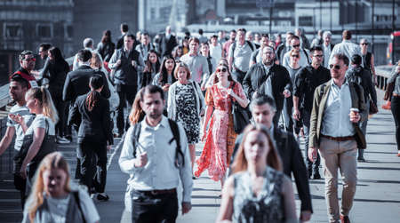 London, UK - 26 June, 2018: Business people and office workers crossing the London bridge on the way to work. City of London busy business life.