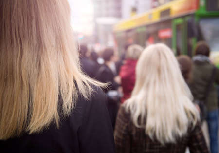 crowd of people on bus stop in the morning.