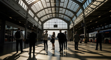 A wide angle view of a busy train station hall with silhouettes of commuters walking and waiting under a large arched window. The sunlight streams through the glass roof, highlighting the architecture and busy transit atmosphere.