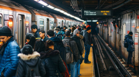 A bustling subway station platform filled with people waiting and boarding trains, showcasing urban life in motion