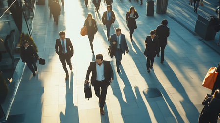 A bustling morning scene of professionals heading to work showcasing the energy of urban life.