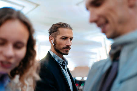 Hipster businessman walking at the station, crowded underground platform, train