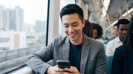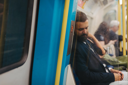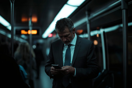 A businessman uses his phone while commuting on a train. The atmosphere is dark and moody.