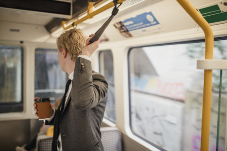 Hipster businessman holding a disposable coffee cup at the train station platform