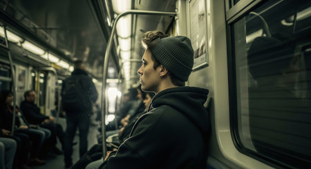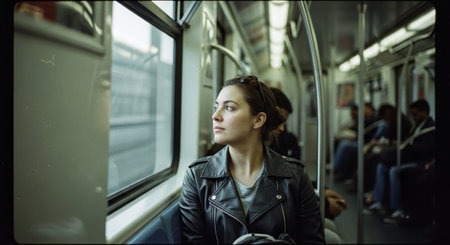 young woman stands in crowded subway train, her serious expression reflecting the busy, focused, anxious energy of commuters during morning rush hour in bustling city. High quality photo
