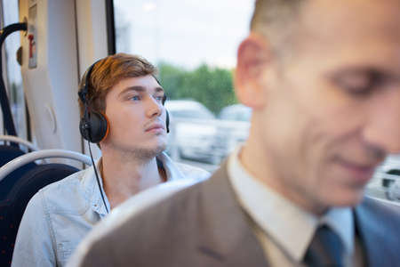 Bus, travel and man with headphones, music and commuting to work in morning, listening or audio. Back, employee and person with tech for playlist, sound and passenger with radio for trip or streaming