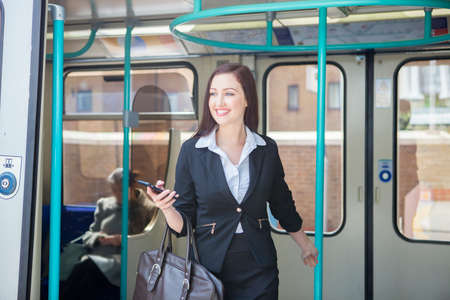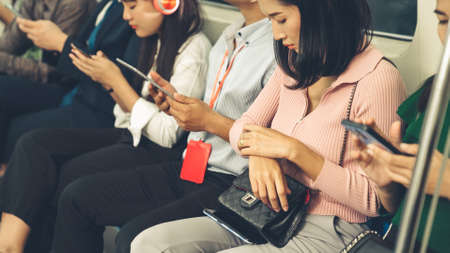Group of people using mobile phones in the subway train. Traveling by train concept.