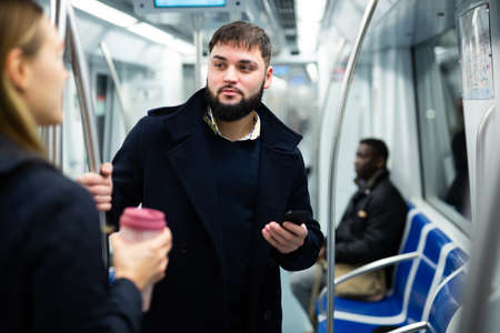 Happy male subway passenger is standing in the train wearing wireless headphones and a smartphone in his hand