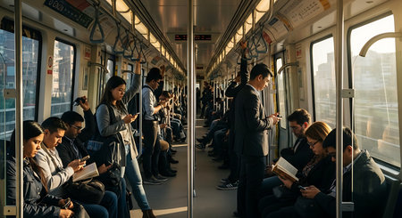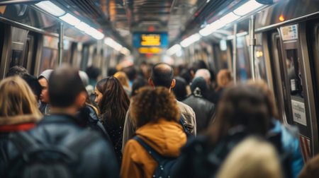 Interior of subway car shows numerous passengers standing, reflecting the crowded and bustling nature of public transit during peak hours.AI Generated