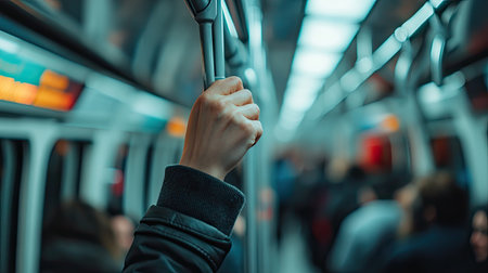 Close-up view of a passenger's hand firmly gripping the overhead strap in a busy subway train, blurred commuters in the background, symbolizing daily urban life