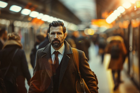 Businessman navigates a crowded subway entrance during rush hour, experiencing the hustle and bustle of urban commuting