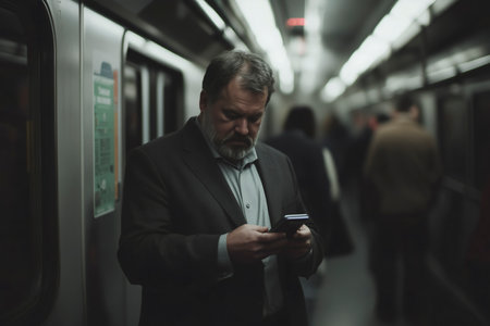 A businessman uses his phone while commuting on a train. The atmosphere is dark and moody.