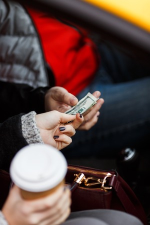 Woman passenger holding coffe and paying driver in taxi. Vertical image