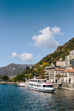 Como, Italy, November 2021. Beautiful view of the lake and the city of Como in the Lombardy region of Italy on a cloudy day. Travel Italy.
