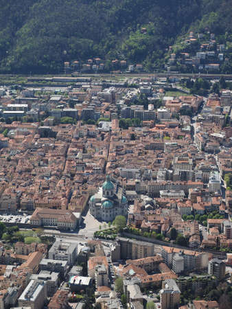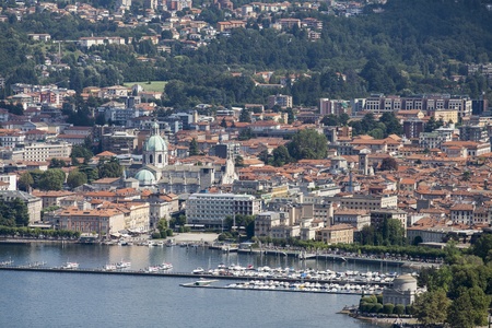 Panoramic aerial view of the city of Como facing the famous Lake Como and the surrounding mountains