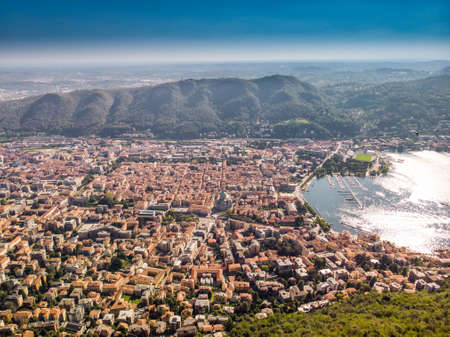 Aerial view of the city of Como, Italy seen from Brunate hill