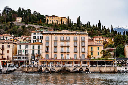 Menaggio, Lombardy, Italy - MAY 11, 2019: View of the famous Menaggio town and the ship on Como Lake, in the Alps before the storm, in inclement weather.