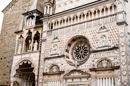 Statues, columns and stucco moldings on the facade of the Colleoni Chapel. Bergamo, Italy