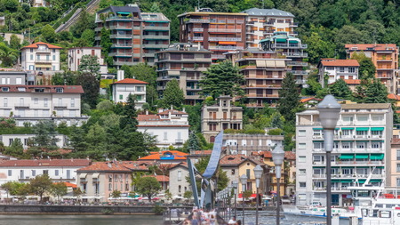 Landscape with Lake Como timelapse, Lombardy, Italy. People walking on pier with monument. Houses and boats on background. Cloudy sky at summer day.