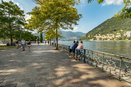 Como, ITALY - August 4, 2019: Local people and tourists on the promenade along the lake in the center of beautiful Italian Como city. Warm sunny summer day in very popular holiday destination