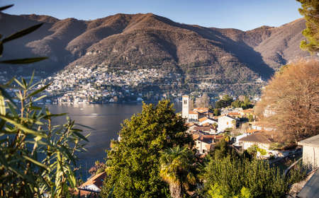 Sunrise autumnal panorama of Lugano with sunlit mountains in the background.