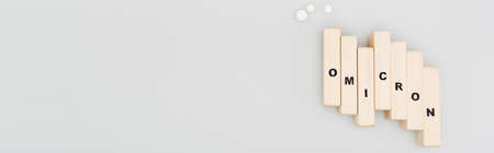 top view of wooden bricks with omicron lettering near pills on grey background, banner