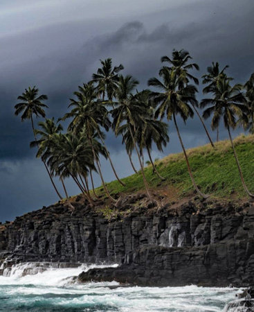Tropical beach on south side of Samoa Island with coconut palm trees.