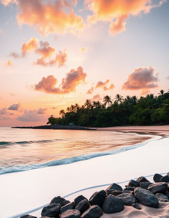 Stunning sunset over a tropical island. Azure waters, white sand beaches