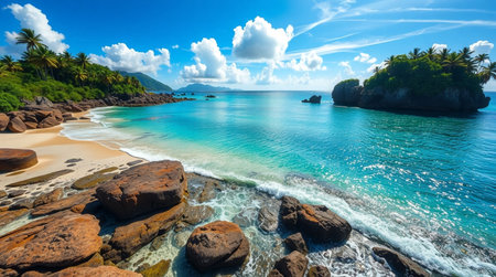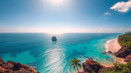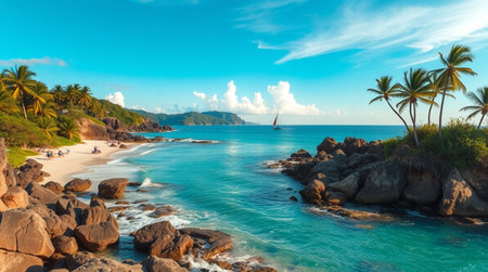 Panoramic view of beautiful beach with palm trees, rocks and turquoise sea in the background
