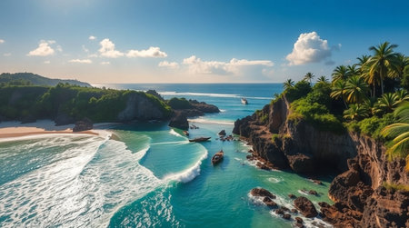Aerial view of beautiful tropical beach with palm trees and turquoise sea water