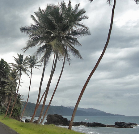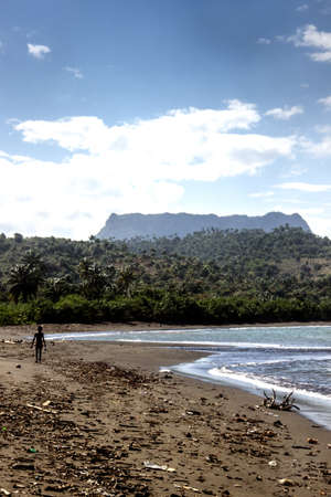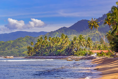Sea view through coco palm trees, tropical nature photo. Tropical island landscape with sea and palm trees. Hiking in volcanic island mountains. Summer vacation in South Asia. Coastal land panorama