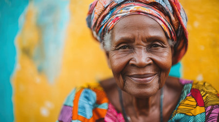 Portrait of a smiling woman with a vibrant african headwrap against a green backdrop