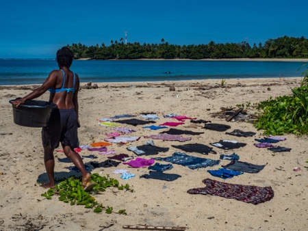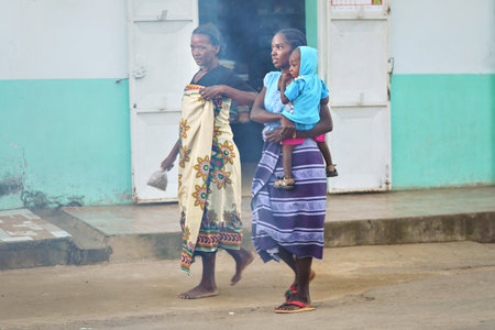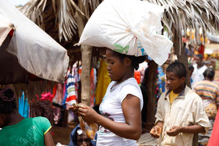 MAROANTSETRA, MADAGASCAR OCTOBER 20.2016: Malagasy woman carry heavy loads on head. The traditional method of transport of goods in Africa. October 20. 2016, Madagascar