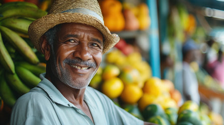 A cheerful man wearing a straw hat smiles warmly with a colorful backdrop of fruits at a vibrant market stall.